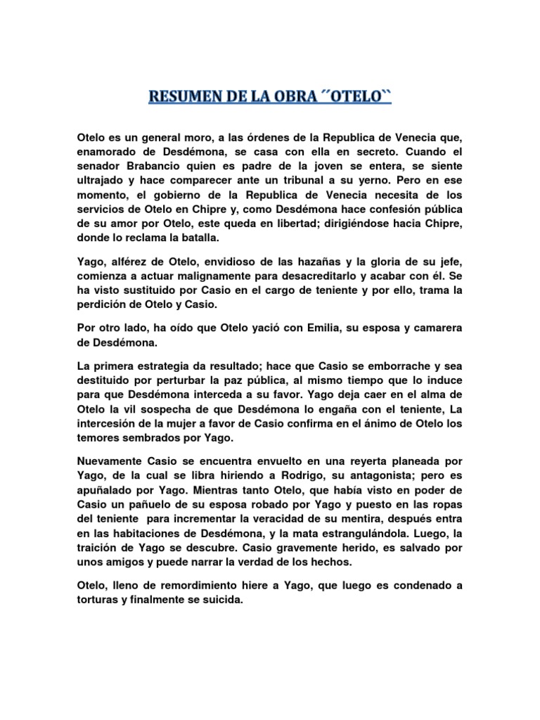 Lee sus frases más interesantes y descargarlo en pdf. A través de este resumen trato dar a entender otelo de una manera mas ligera y coloquial para que así no se les haga tan pesado la forma de contar a otelo y tal vez que les nazca la curiosidad por. Otelo le pide a yago entregar unas cartas al senado mientras que él irá a inspeccionar las murallas otelo, arrebatado por celos y la pasión, le solicita a yago asesinar a casio en los próximos tres días. Te explicamos qué es un resumen y los tipos de resumen que existen. Información sobre libros para elegir una buena lectura.